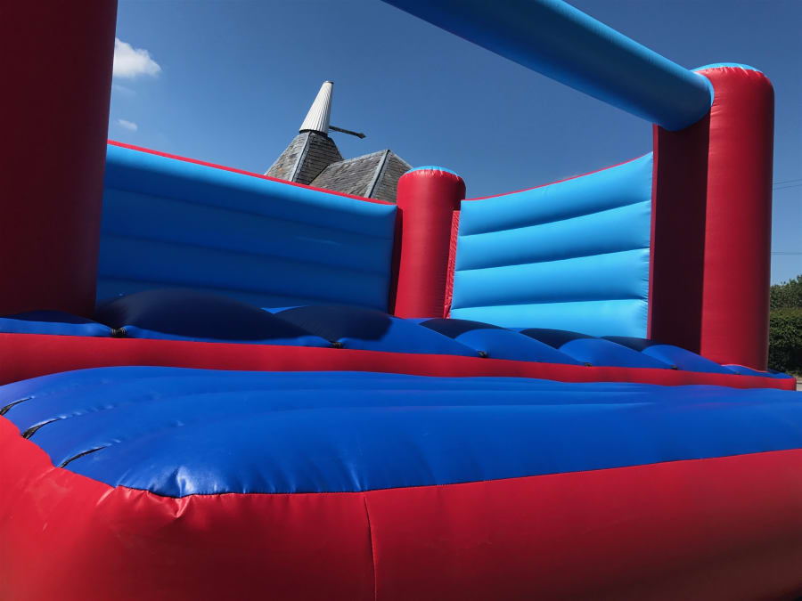 Our trained, professional team will install the inflatable using a PAT tested electric fan and fifty metres of shower proof cable; we use metal anchor pegs to secure the inflatable when being set up outdoors on grass. We supply crash mats as standard.