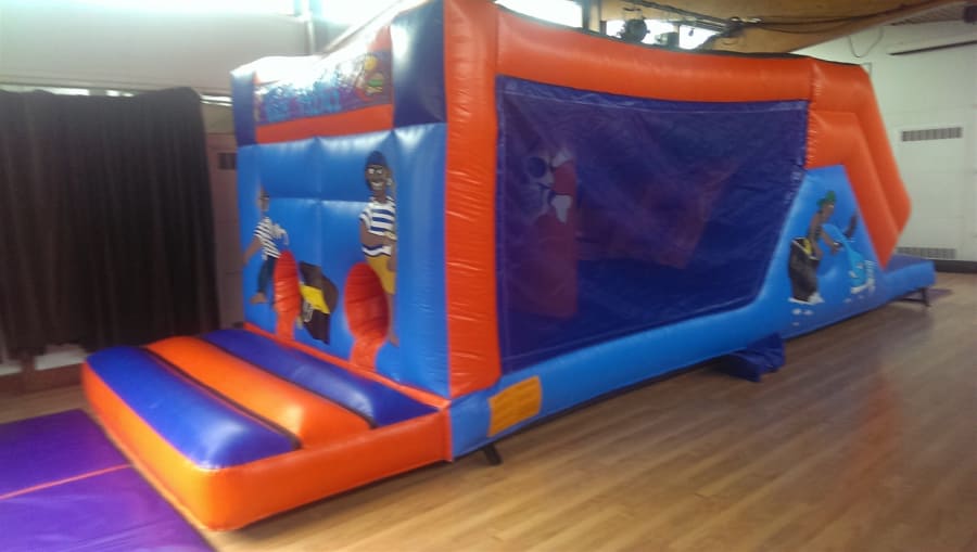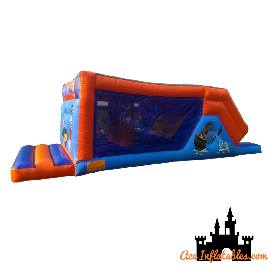 Our twenty-six foot by ten-foot pirates assaults course is one of our top of the range inflatables, with bouncy beds, stunning artwork, and a six-foot-six slide.