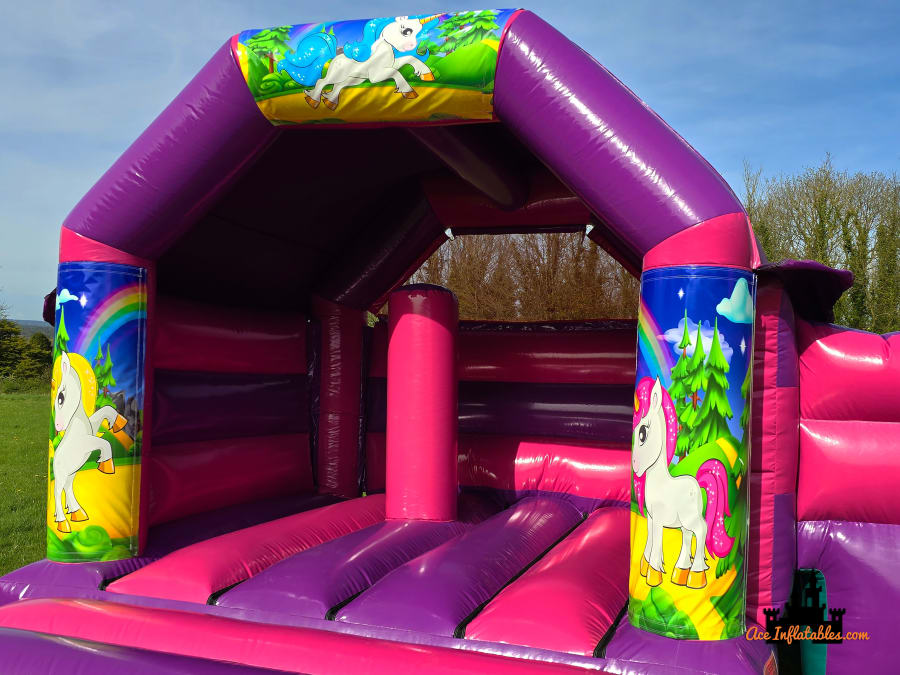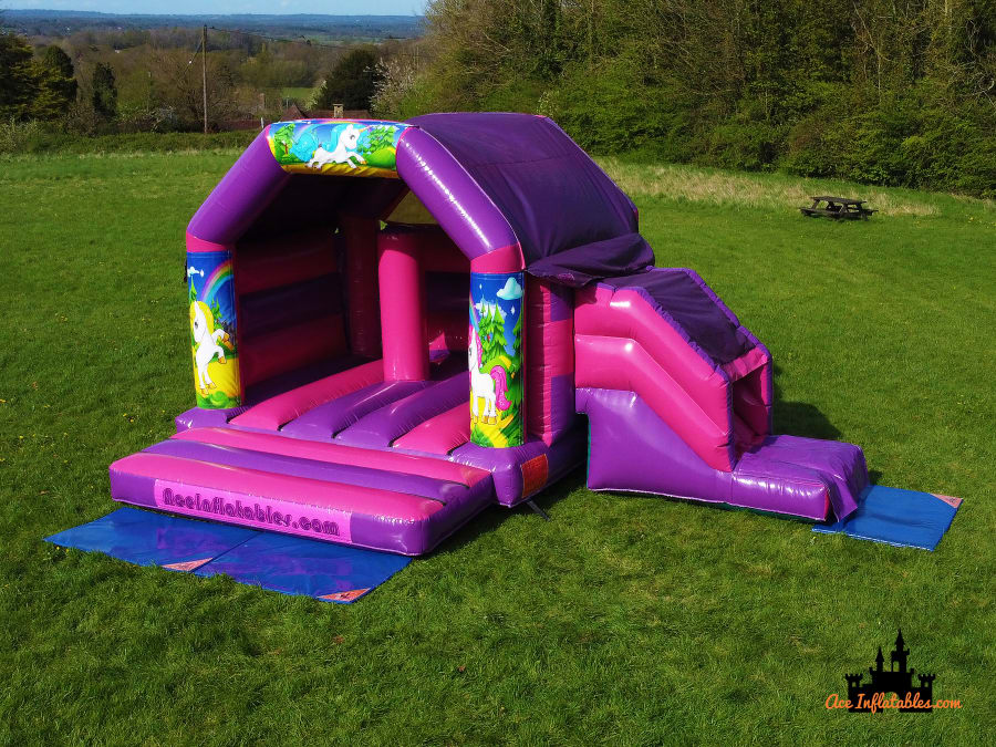 This Unicorn Pink and Purple Bounce and Slide is a hit with children, providing hours of entertainment and joy. Our trained staff will safely install this inflatable using a PAT tested electric fan and secure it with metal anchor pegs when set up outdoors on grass. โก