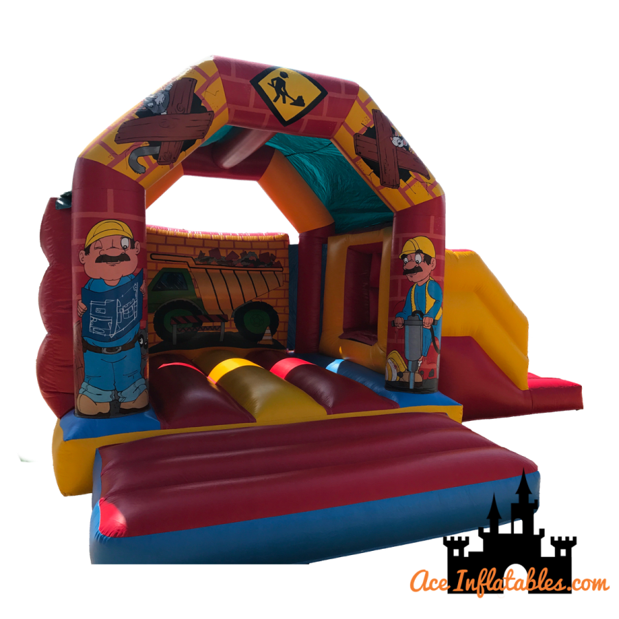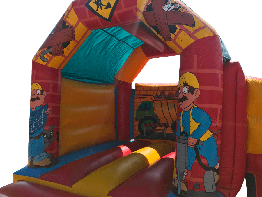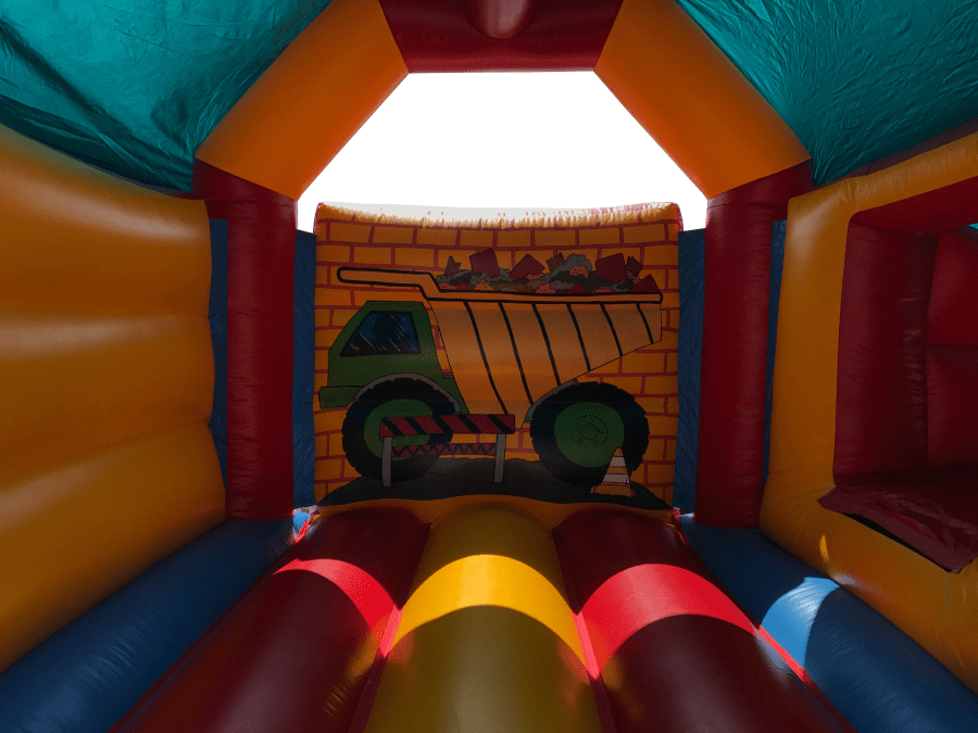 Construction bounce and slide especially made in bright colours with appealing artwork and a specially engineered bed for extra bounce.