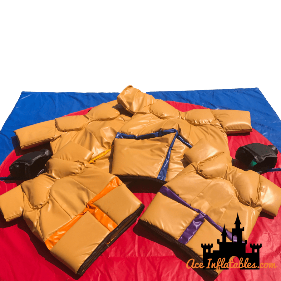 Sumo Wrestler Suits family package supplied with one set of children's suits and head gear one set of adult suits and head gear and one padded fight mat.