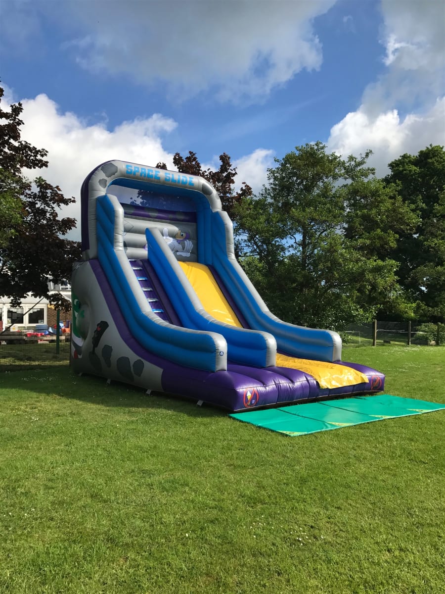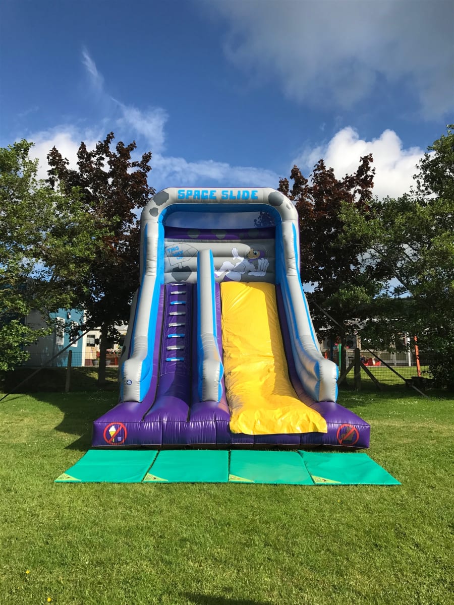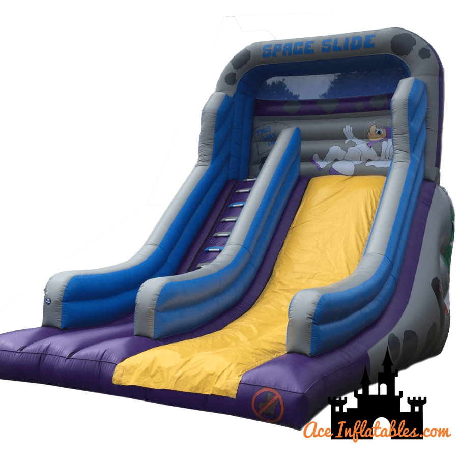 The inflatable Mega Space slide is a big hire standing at twenty-four foot high with a platform height of ten foot.
